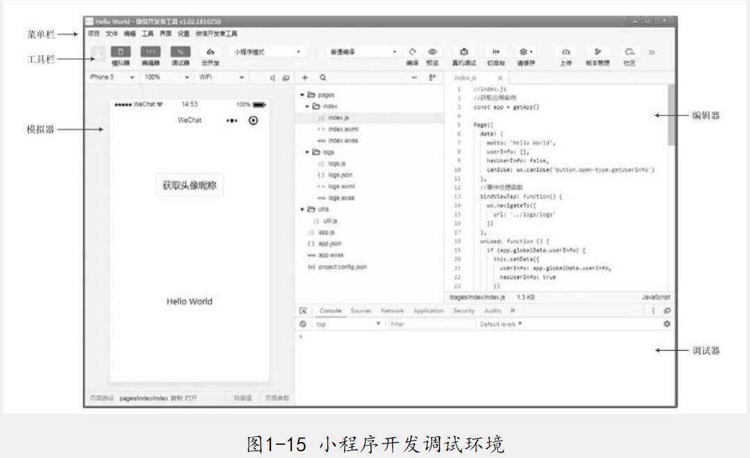 從圖1-15中可以看出,微信開發(fā)者工具的主界面主要由菜單欄、工具欄、模擬器、編輯器和調試器組成。接下來對這些功能分別進行講解。