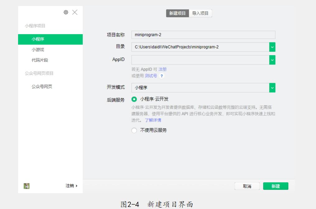 我們一般推薦大家使用穩(wěn)定版進(jìn)行開發(fā)。但是因?yàn)榉€(wěn)定版的發(fā)布周期較長,往往一兩個(gè)月才會(huì)出一次版本,因此如果在使用穩(wěn)定版時(shí)遇到bug,可以酌情采用預(yù)發(fā)布版和開發(fā)版的安裝包。打開開發(fā)者工具后,用微信掃一掃即可進(jìn)入項(xiàng)目選擇界面。單擊“新增小程序”標(biāo)志,進(jìn)入圖2-4所示的“新建項(xiàng)目”頁面。