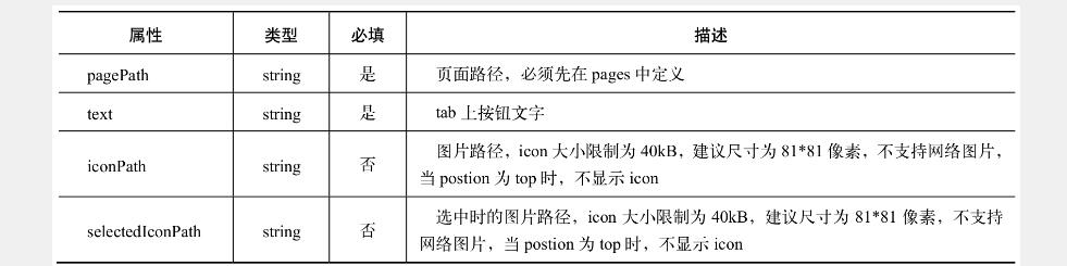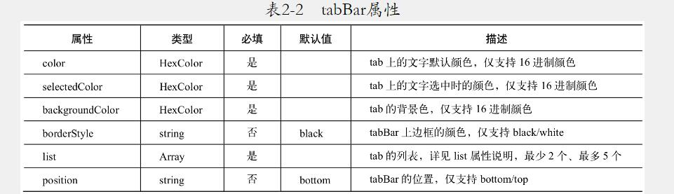 tabBar是多tab應用時使用的,用戶可以在微信小程序的底部切換頁面,建議最少2個,最多5個。其屬性如表2-2所示,