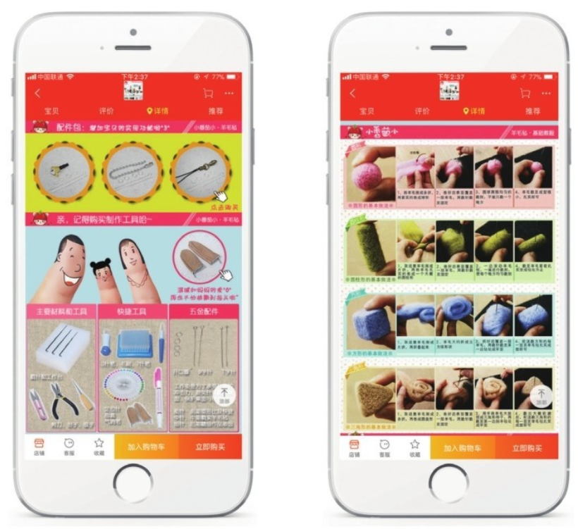 除了添加娛樂游戲板塊來增強消費者購物的參與感,讓其獲得更多的趣味性體驗以外,互動感還可以通過商品詳情頁傳遞給消費者。羊毛氈DIY材料包的詳情說明以及詳細的操作步驟如圖8-25所示,這樣的展示能夠進一步增強消費者與商品的互動感。