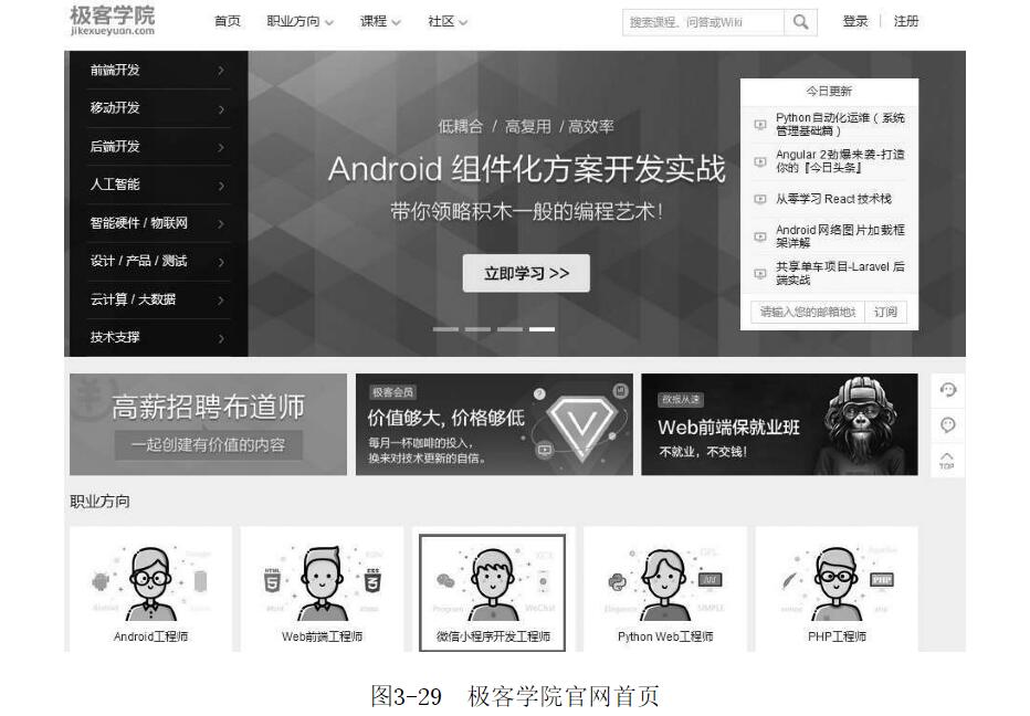 小程序的發(fā)展將帶來市場對小程序工程師需求的增加,而快速成為小程序工程師較為簡單有效的方法就是進行專業(yè)培訓(xùn),這便給各大小程序工程師培訓(xùn)機構(gòu)帶來了發(fā)展契機。正是因為看到了這一層面的需求,某些平臺專門開設(shè)了小程序工程師的培訓(xùn)課程。比如,極客學(xué)院在其官網(wǎng)首頁的“職業(yè)方向”板塊中,設(shè)置了“微信小程序開發(fā)工程師”一欄,如圖3-29所示。