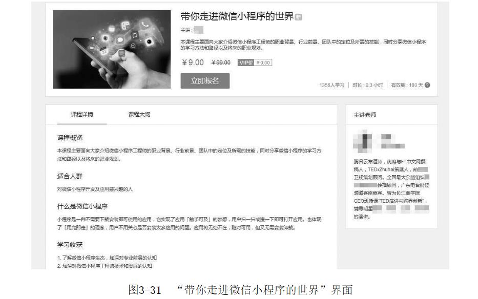 圖3-31 “帶你走進微信小程序的世界”界面專家提醒小程序培訓(xùn)課程之所以被視為具有較大潛力的市場,主要是因為它可以為以下幾類人提供便利: