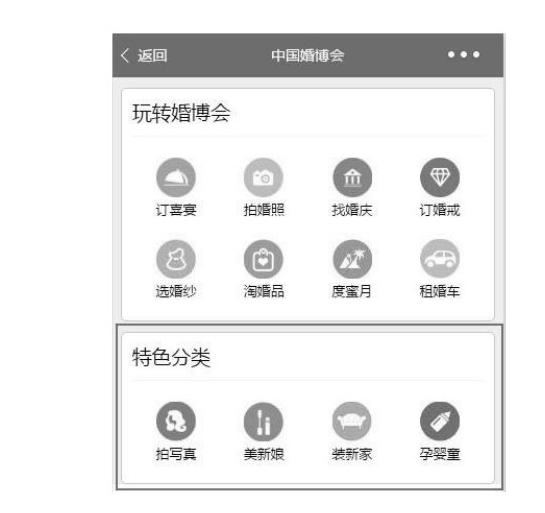深圳小程序制作公司提醒全部分類導(dǎo)航界面集合了中國(guó)婚博會(huì)所有的導(dǎo)航入口,它可以分為3類導(dǎo)航:玩轉(zhuǎn)婚博會(huì)導(dǎo)航,有訂喜宴、拍婚照、找婚慶等服務(wù);特色分類導(dǎo)航,有拍寫真、美新娘等服務(wù);我的婚博會(huì)導(dǎo)航,有現(xiàn)金券、邀請(qǐng)函、簽到禮等服務(wù)。這3類導(dǎo)航布局方式一樣,可以先設(shè)計(jì)一類導(dǎo)航,然后直接進(jìn)行復(fù)用,如圖8.22所示。
