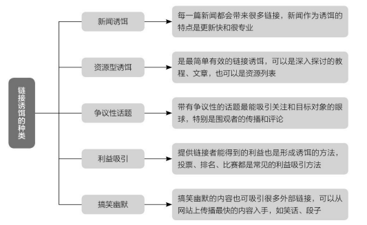鏈接誘餌有很多種類,小程序運(yùn)營(yíng)者可以根據(jù)誘餌的種類來(lái)思考吸引鏈接的方法,圖7-21所示為鏈接誘餌的常見(jiàn)種類。