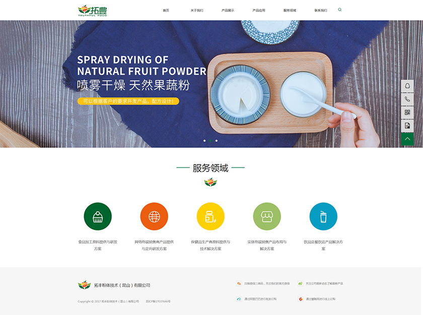 拓豐粉體技術(shù)有限公司:坐落交通便利,風(fēng)景優(yōu)美的江南古鎮(zhèn)——昆山千燈,專業(yè)從事食品原料素材粉體化的研發(fā)、生產(chǎn)、銷售。公司擁有近20年的果汁粉的行業(yè)經(jīng)驗,引進(jìn)國際先進(jìn)的干燥設(shè)備,結(jié)合優(yōu)勢的原料資源,研發(fā)生產(chǎn)優(yōu)質(zhì)天然果蔬汁粉。拓豐粉體公司對原料的謹(jǐn)慎選擇,對制成的精密把控,對檢測設(shè)備和技術(shù)的嚴(yán)苛標(biāo)準(zhǔn),確保了產(chǎn)品的安全性和穩(wěn)定性!拓豐團(tuán)隊用良好的服務(wù),誠摯的熱情,期待與您攜手,共創(chuàng)食品的安全、健康、營養(yǎng),創(chuàng)造食品為無限可能!