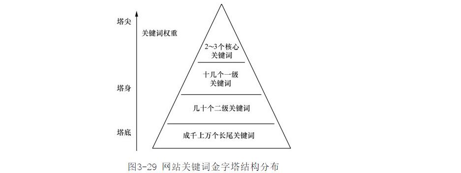選好關(guān)鍵詞后,需要對關(guān)鍵詞進行有序的排列。一般來說,網(wǎng)站的關(guān)鍵詞分布應該符合金字塔形結(jié)構(gòu),依據(jù)網(wǎng)站關(guān)鍵詞的權(quán)重將關(guān)鍵詞分為塔尖、塔身、塔底三個部分,如圖3-29所示。