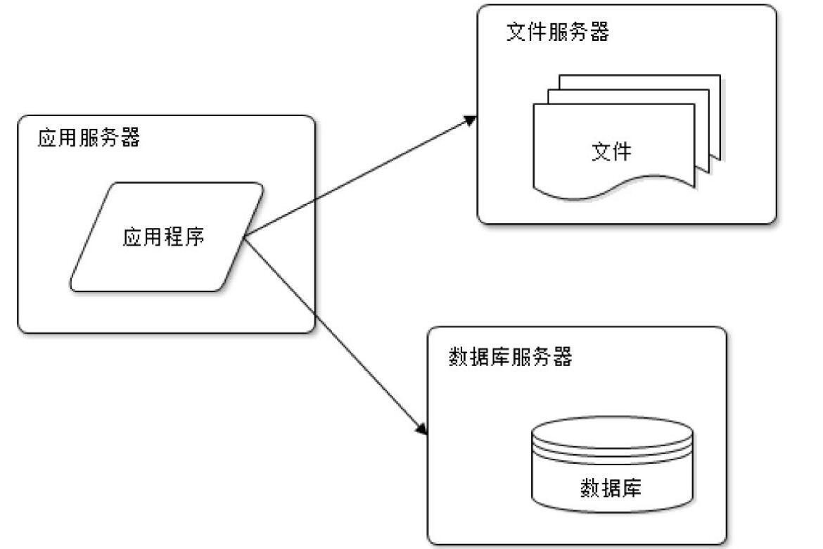 2.應(yīng)用服務(wù)和數(shù)據(jù)服務(wù)分離隨著網(wǎng)站業(yè)務(wù)的發(fā)展,一臺(tái)服務(wù)器逐漸不能滿足需求:越來(lái)越多的用戶訪問(wèn)導(dǎo)致性能越來(lái)越差,越來(lái)越多的數(shù)據(jù)導(dǎo)致存儲(chǔ)空間不足。這時(shí)就需要將應(yīng)用和數(shù)據(jù)分離。應(yīng)用和數(shù)據(jù)分離后整個(gè)網(wǎng)站使用三臺(tái)服務(wù)器:應(yīng)用服務(wù)器、文件服務(wù)器和數(shù)據(jù)庫(kù)服務(wù)器,如圖1.2所示。