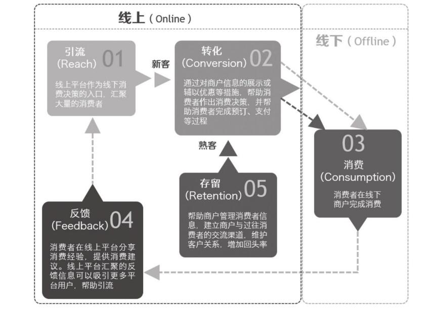 圖2-1O2O網(wǎng)站建設平臺布局的“五階段模型”專家提醒灰色箭頭形成的閉環(huán)代表一般消費者(新客)的決策、消費流程;黑色箭頭形成的閉環(huán)則表示熟客的消費過程。